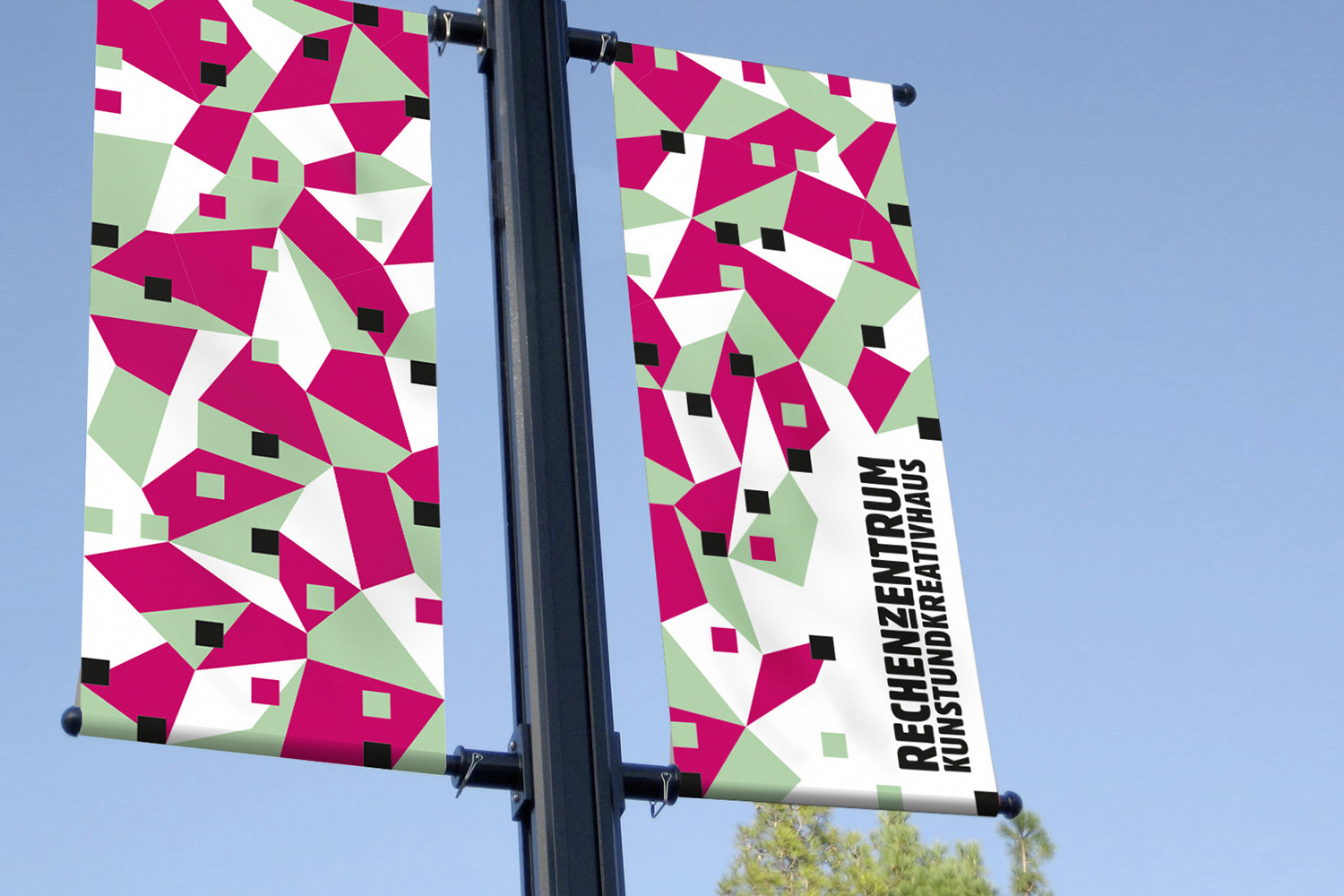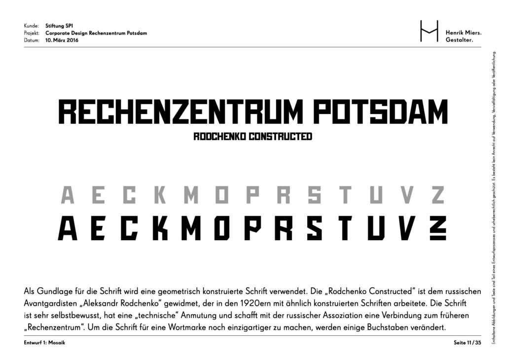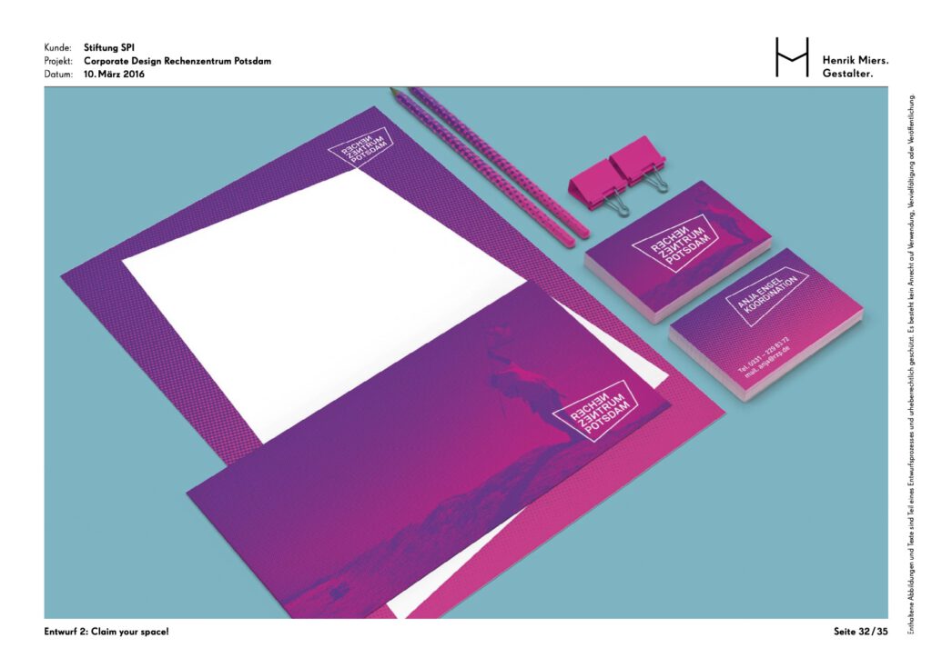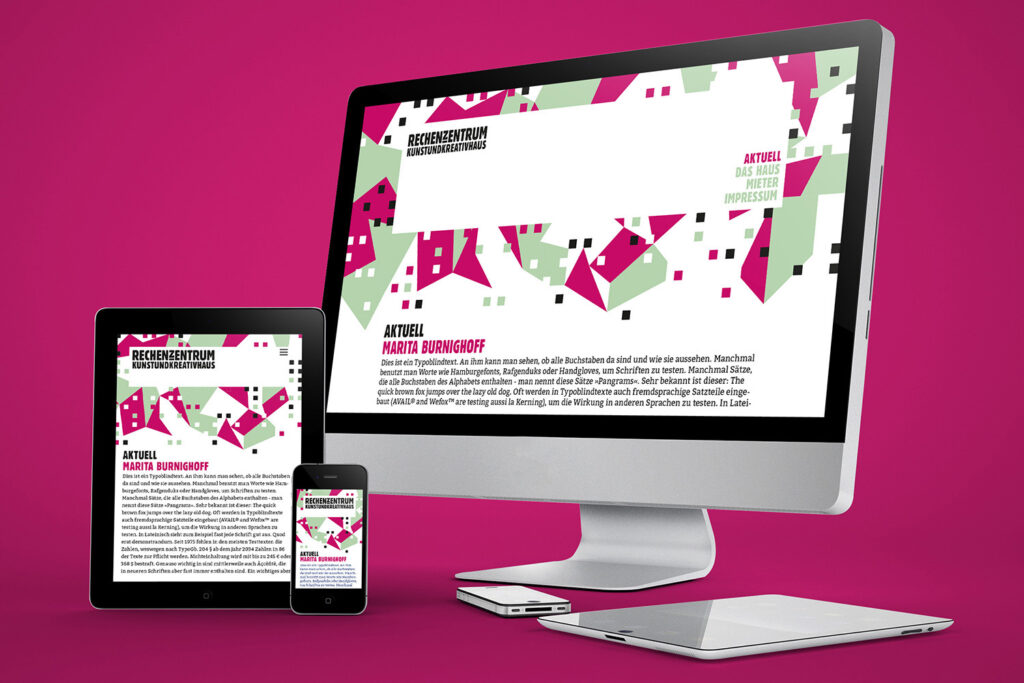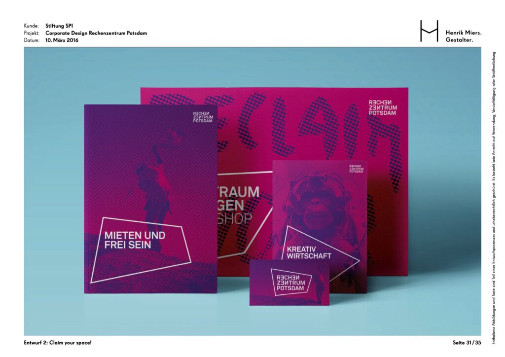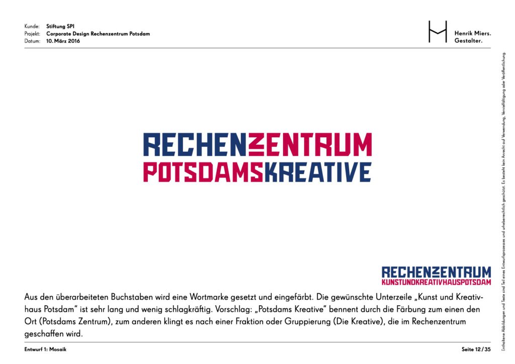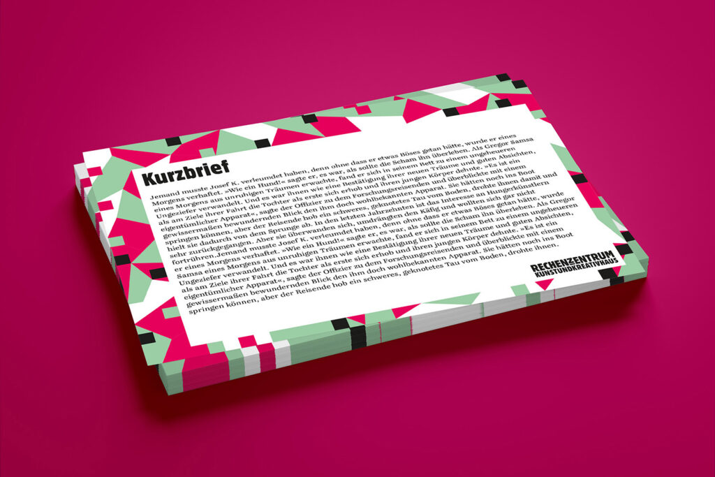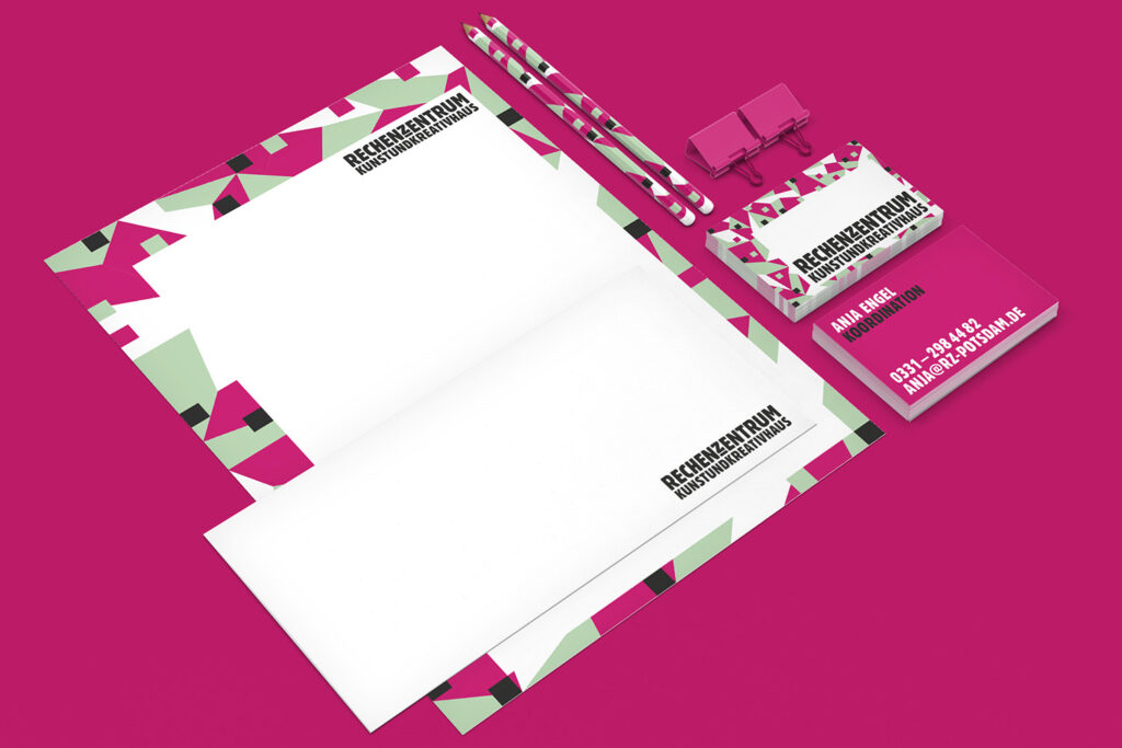The Rechenzentrum as a creative hub in the heart of Potsdam was given a visual identity through the development of a corporate design. The building’s unmistakable hallmark is the facade mosaic, which is also reflected in an abstracted form within the brand identity.